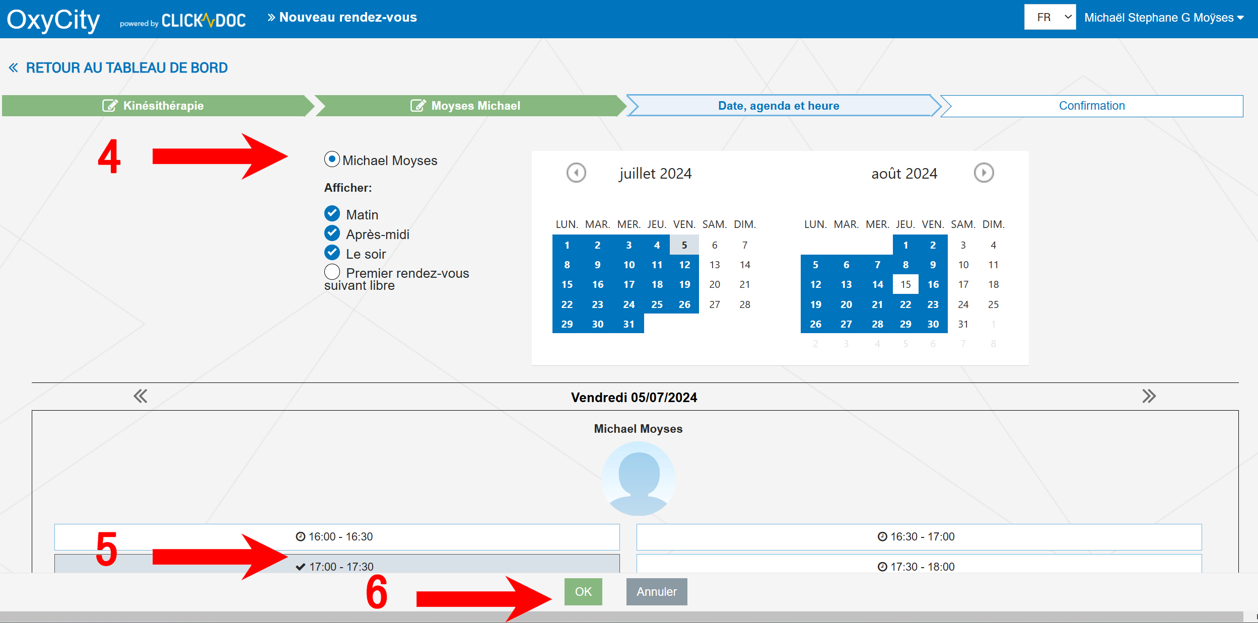 - !!! dans la partie agenda, sélectionnez Michael Moyses pour avoir accès aux disponibilités (info)